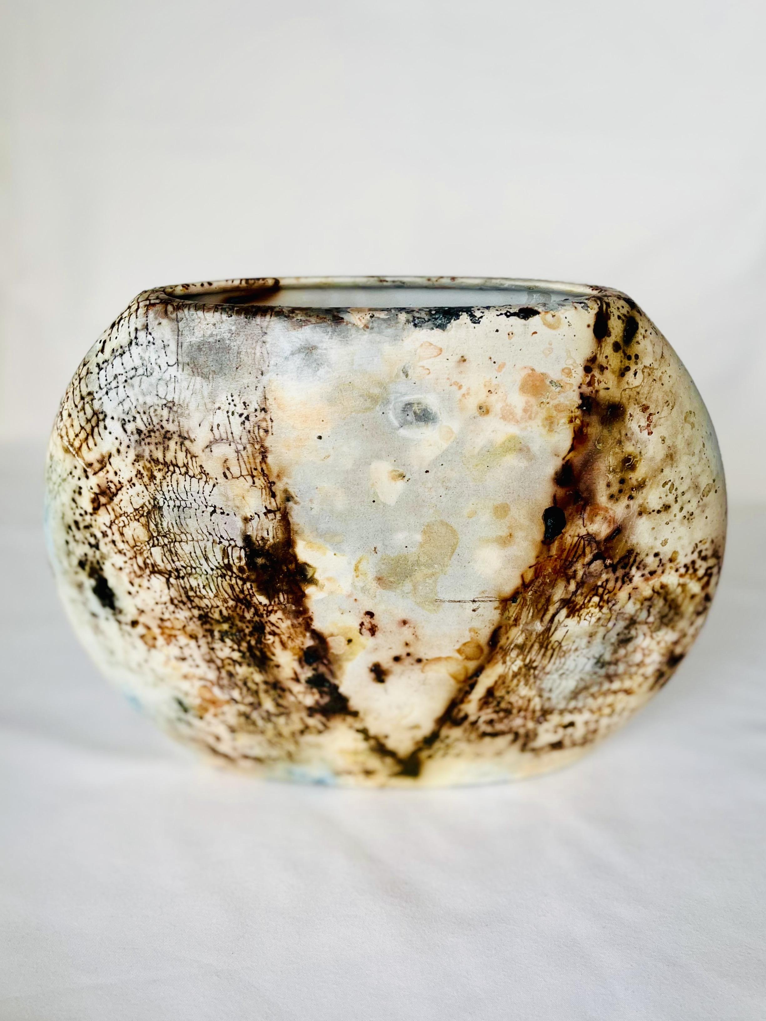 Yüzeyindeki desenler, pişirim öncesinde çeşitli organik ve inorganik unsurlarla beraber paketlenmiş bisküvi haldeki vazo, dumanlı indirgen ortamda 1040 derecede pişirilerek oluşturulmuştur.