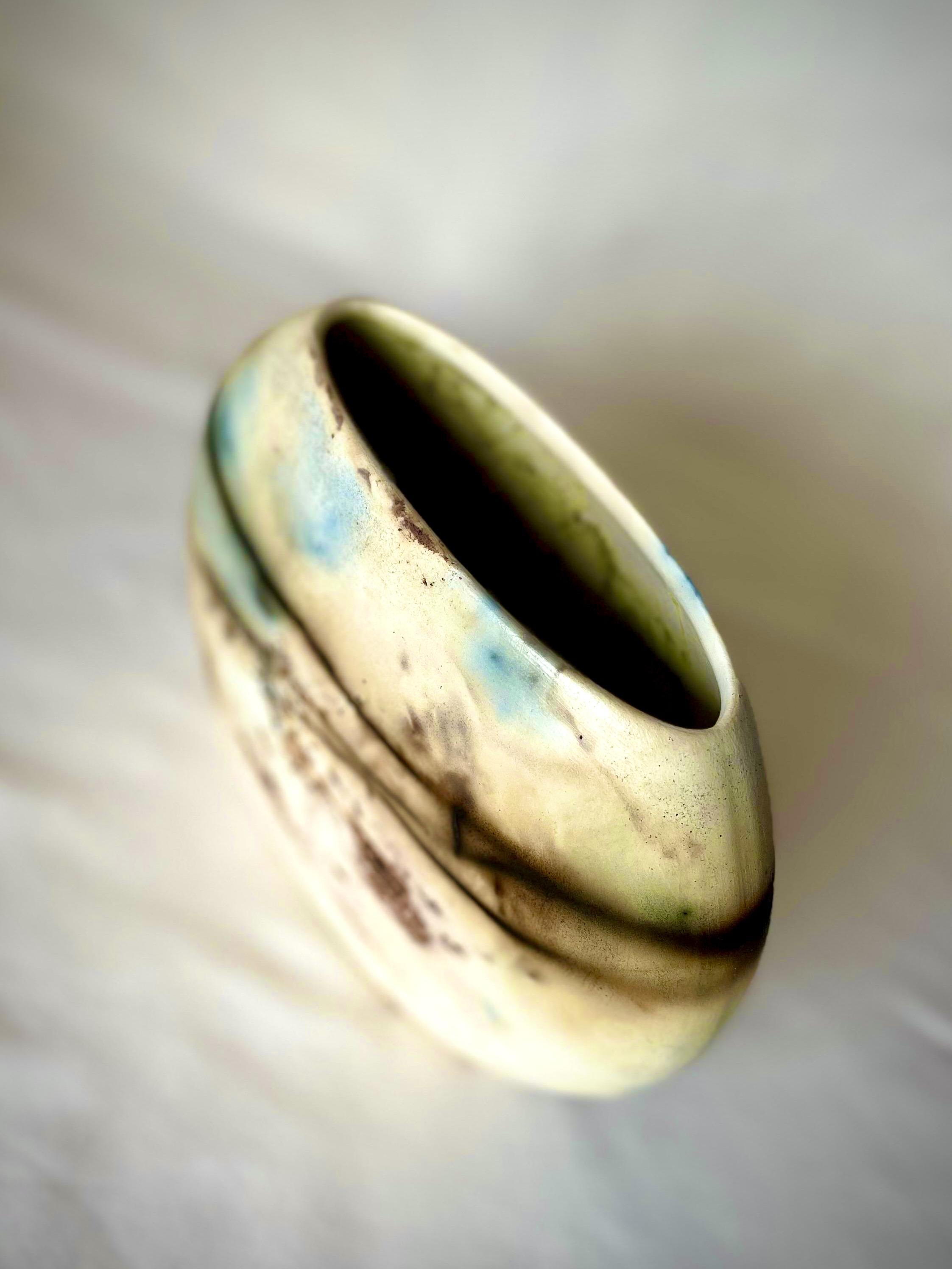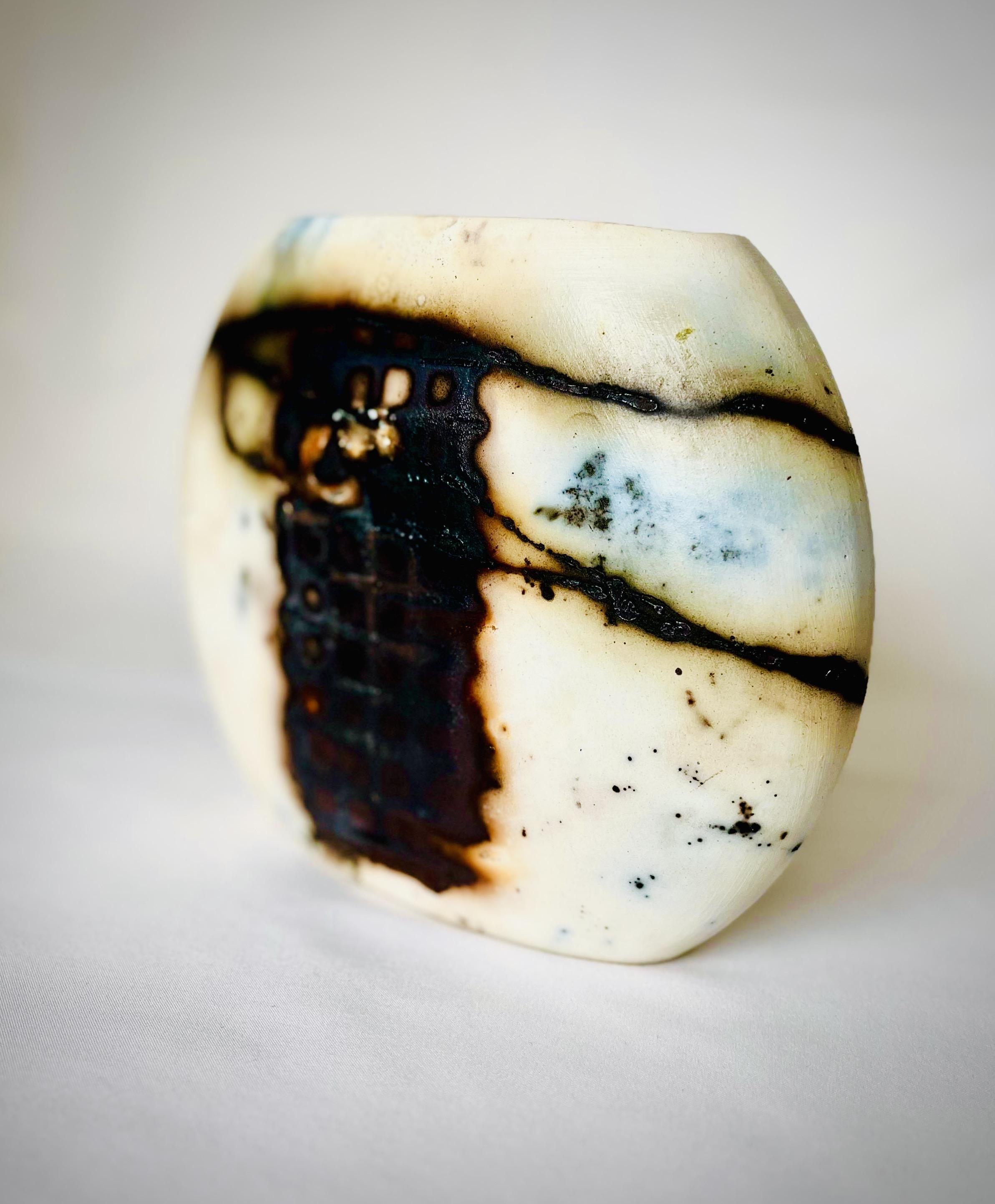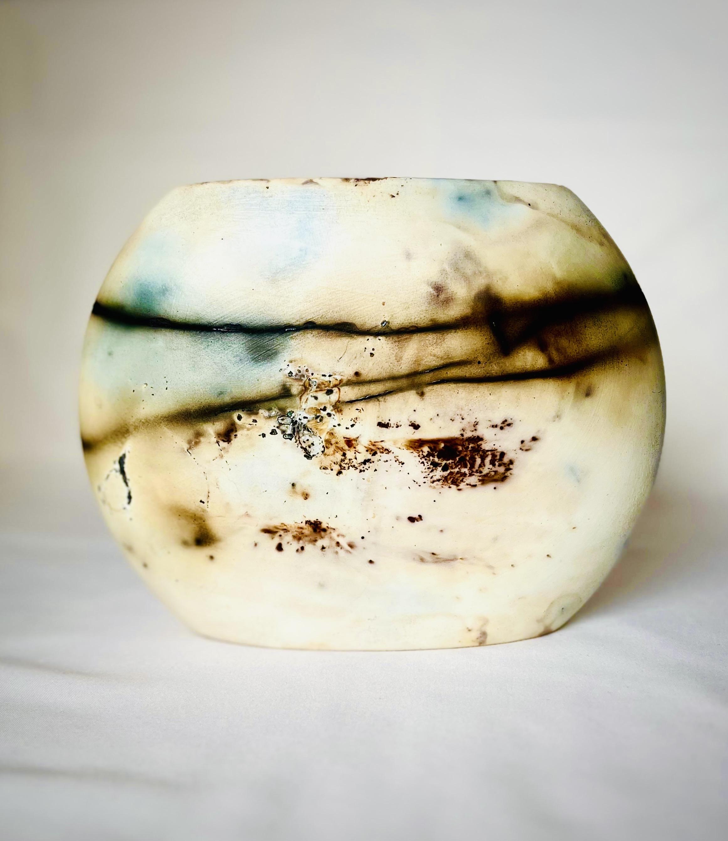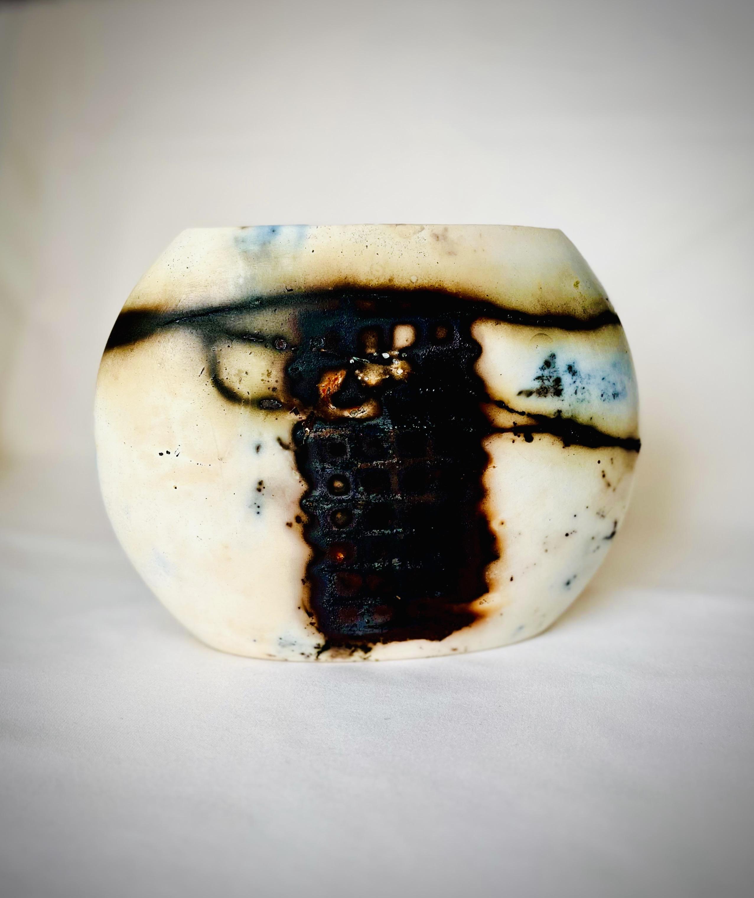 Ev dekorasyonunda şıklığı ve zarafeti bir araya getiren bu eser, Japon seramik sanatının geleneksel pişirim metotlarından biri olan "Sagar" yöntemiyle üretilmiştir. Hem modern hem de klasik tarzda mekanlar için mükemmel bir tamamlayıcı olan bu vazo, estetik tasarımıyla öne çıkıyor. Yüzeyindeki desenler, pişirim öncesinde çeşitli organik ve inorganik unsurlarla beraber paketlenmiş bisküvi haldeki vazo, dumanlı indirgen ortamda 1040 derecede pişirilerek oluşturulmuştur.