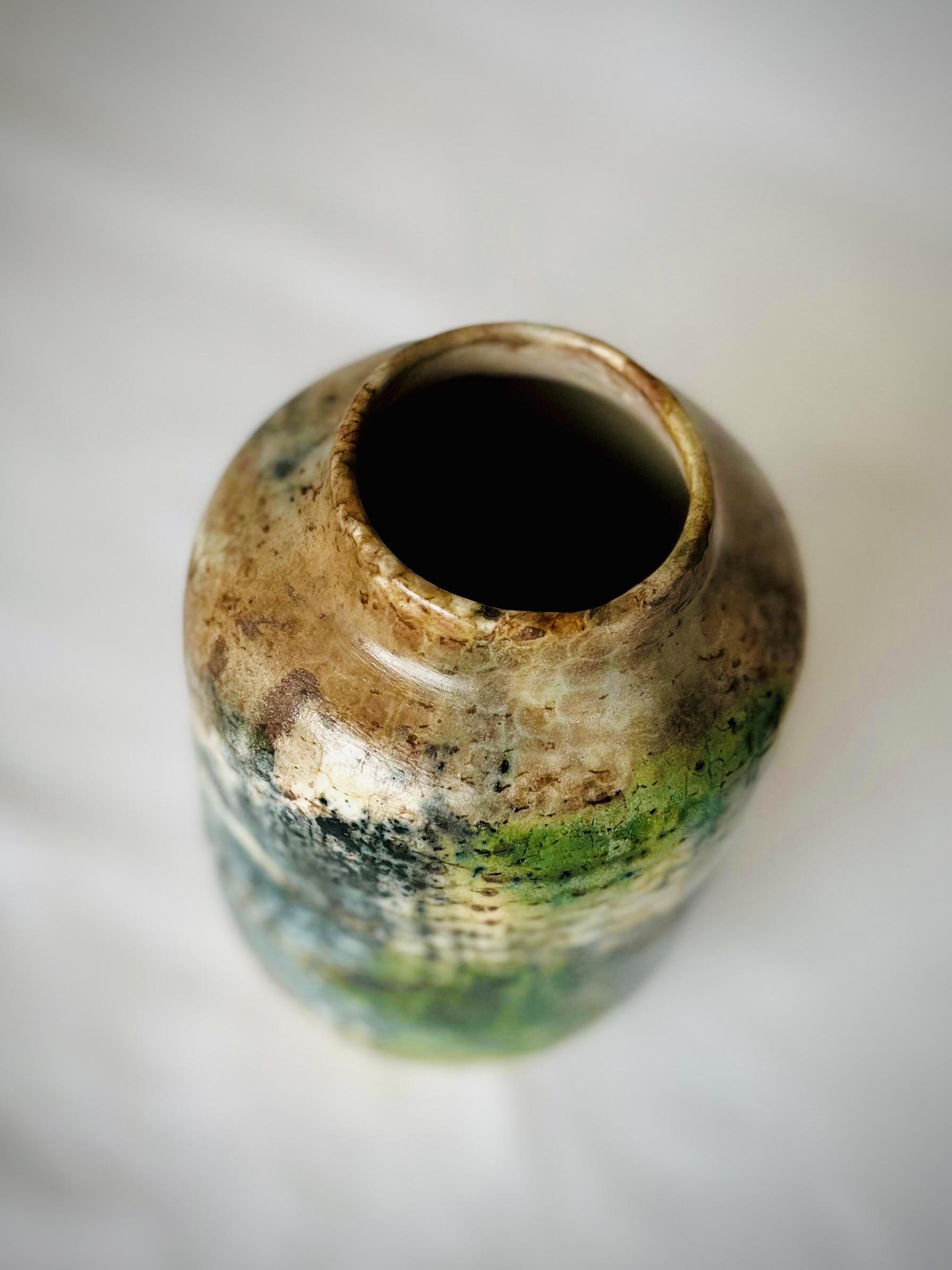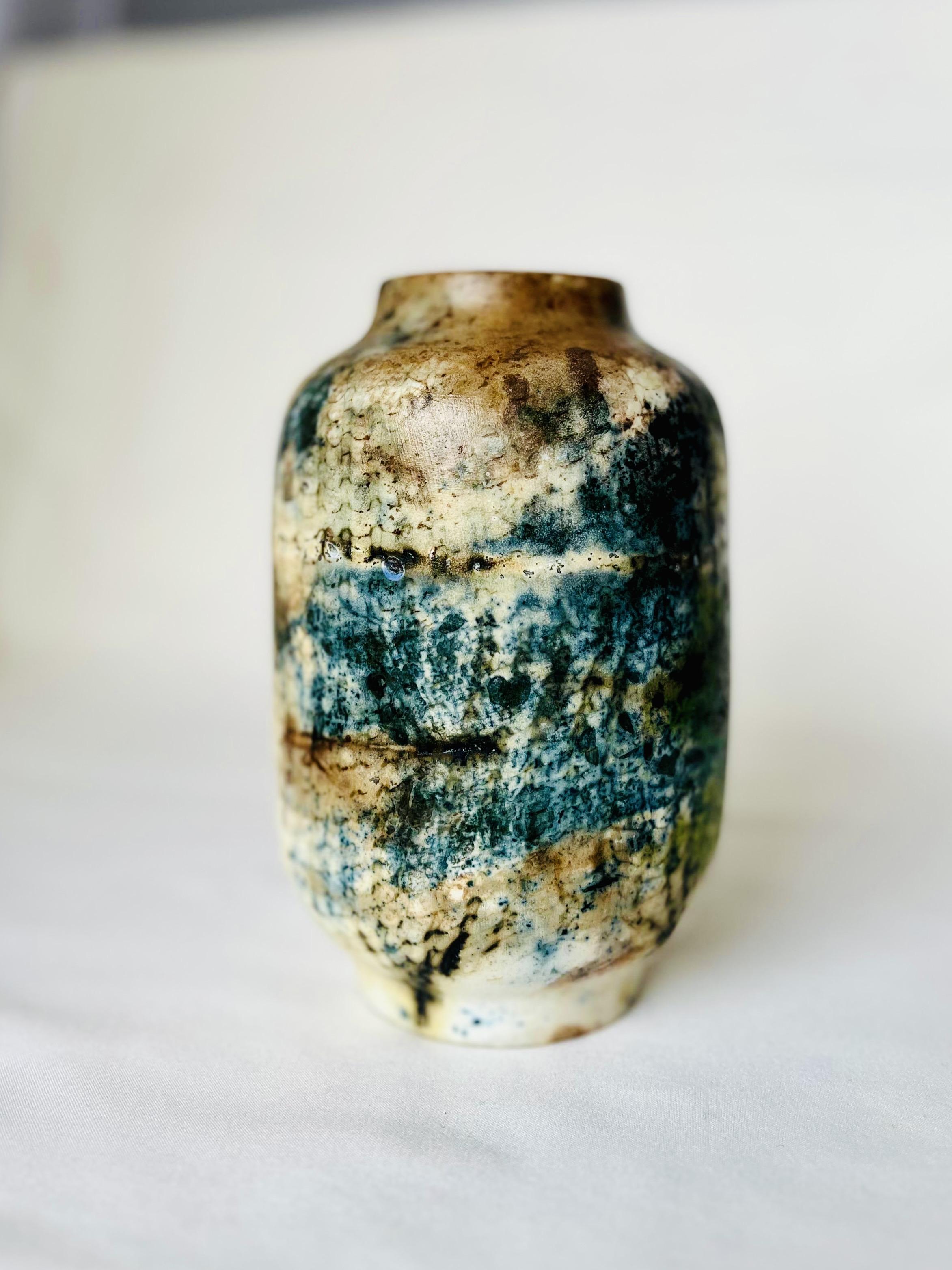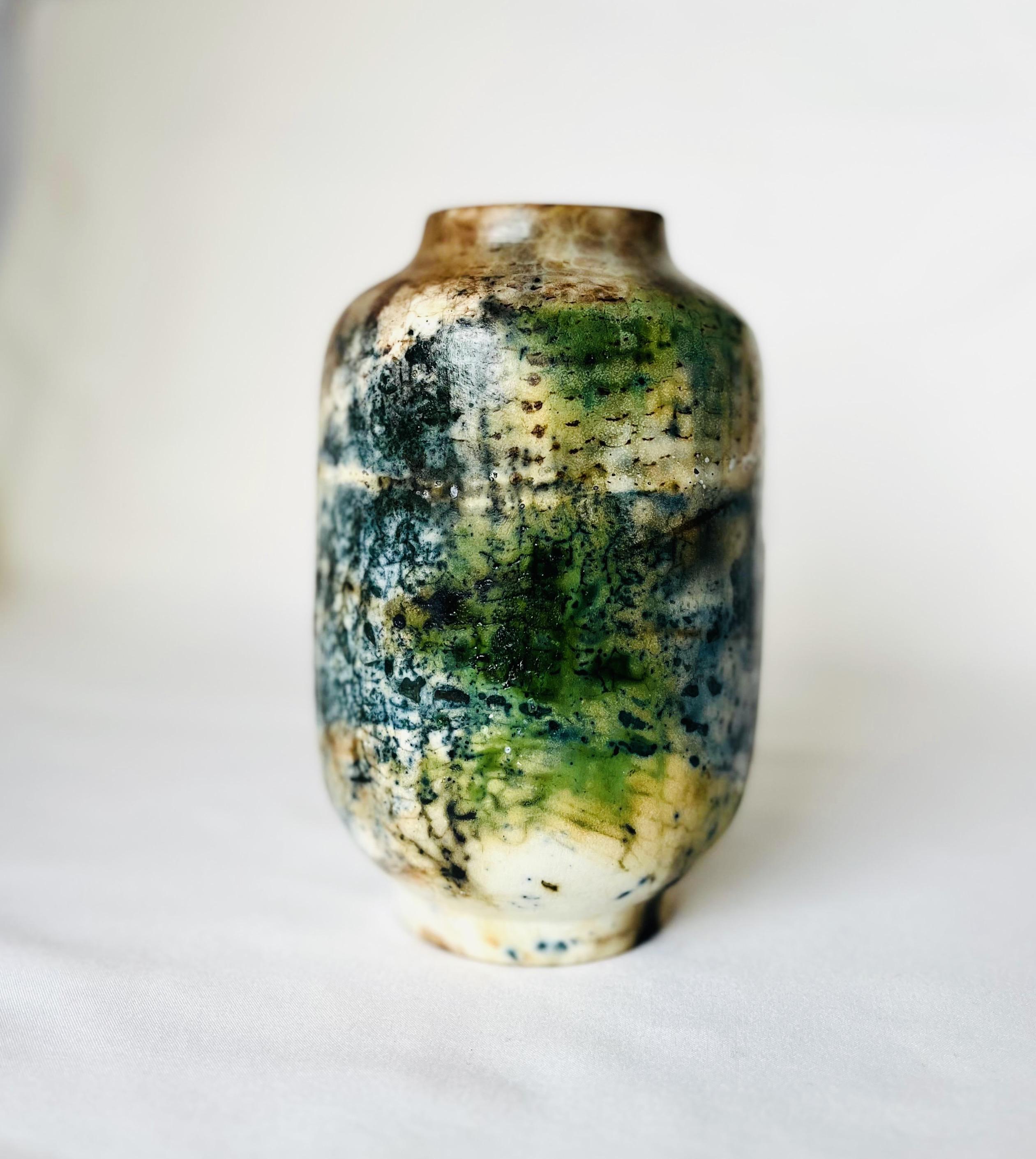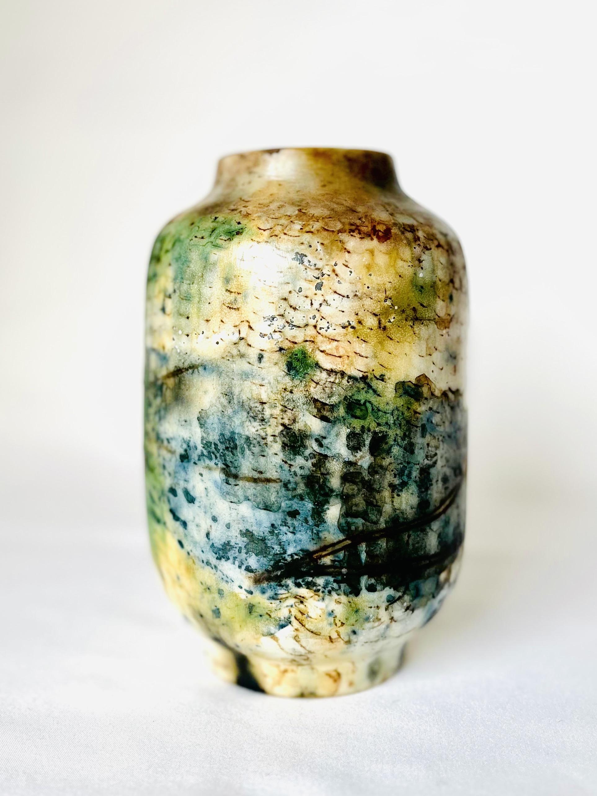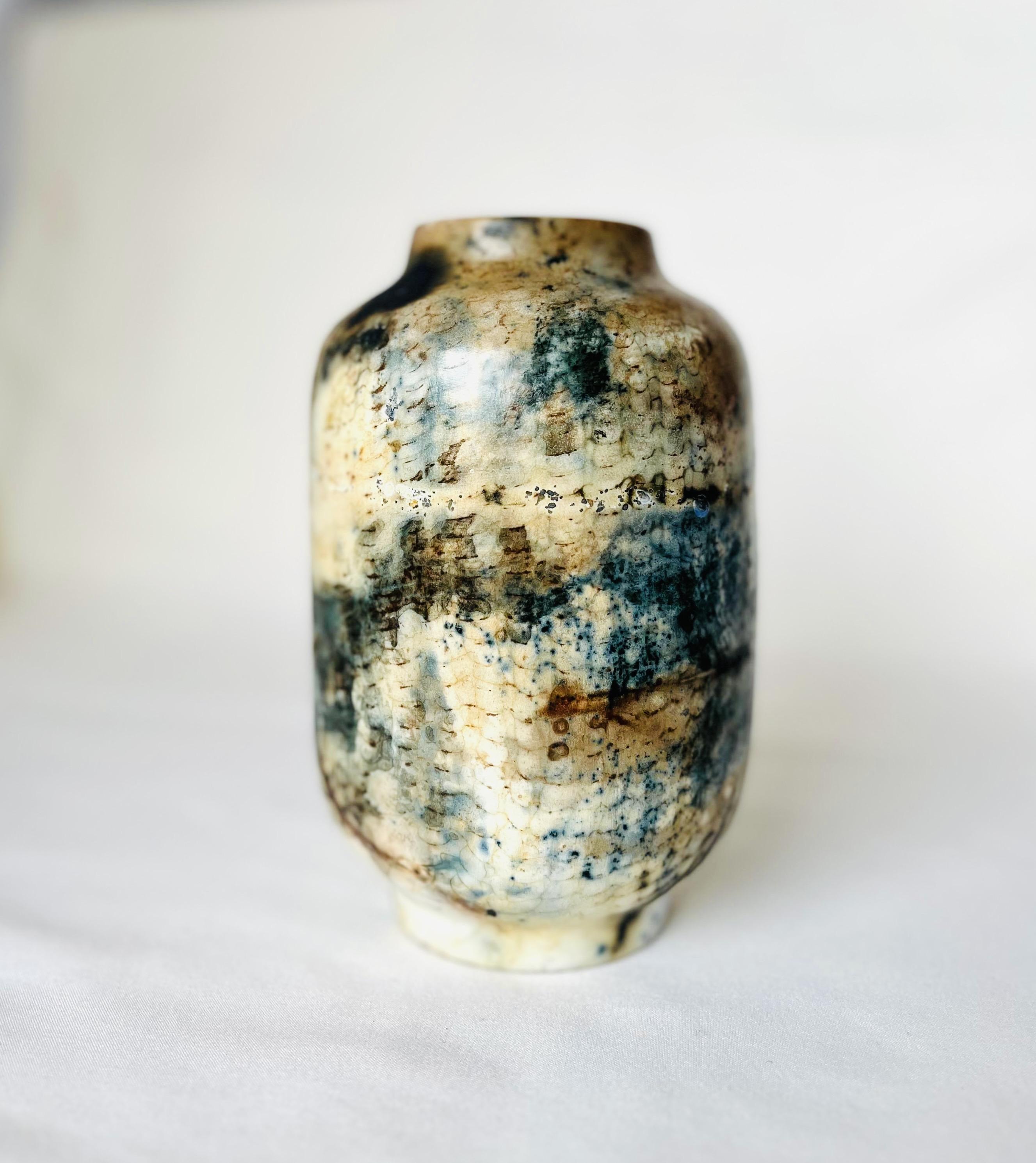Uzak Doğu esintisini ve zarafeti bir araya getiren bu eser, Japon seramik sanatının geleneksel pişirim metotlarından biri olan "Sagar" yöntemiyle üretilmiştir. Hem modern hem de klasik tarzda mekanlar için mükemmel bir tamamlayıcı olan bu vazo, estetik tasarımıyla öne çıkıyor. Yüzeyindeki desenler, pişirim öncesinde çeşitli organik ve inorganik unsurlarla beraber paketlenmiş bisküvi haldeki vazo, dumanlı indirgen ortamda 1040 derecede pişirilerek oluşturulmuştur.